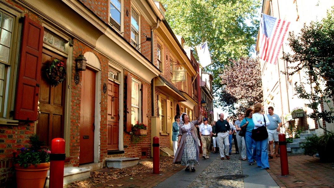 Guides take groups on a stroll through Elfreth’s Alley in Philadelphia’s Old City neighborhood, pointing out the collection of early American houses along the way.