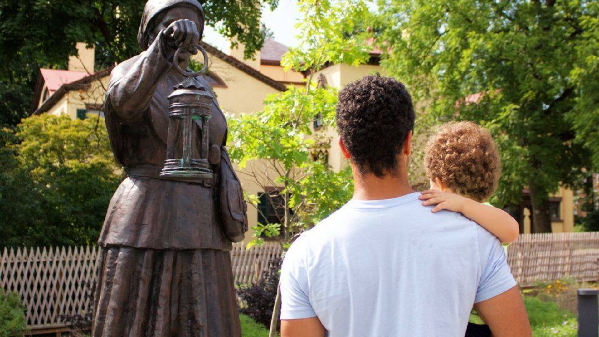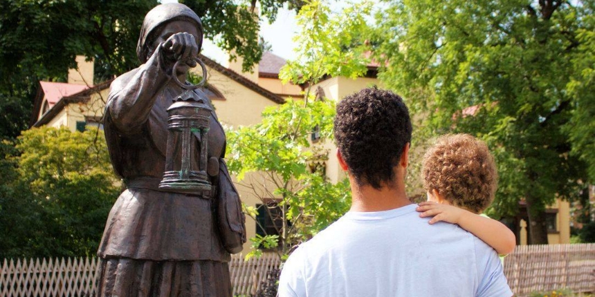 Harriet Tubman holds the ring of a lantern in her hand, illuminating the pathway to freedom in this bronze statue in Auburn, N.Y.