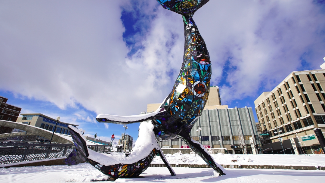 You don’t have to be an avid skier to enjoy the beauty of the snow-covered city. Take a free, self-guided walking art tour to discover the city’s creative touch. Explore the vibrant streets of Neon Line District and the Riverwalk, home to large murals and world-class art installations, such as Space Whale, a life-sized stained glass and steel sculpture of a humpback whale mother and calf (be sure to see it illuminated at night).