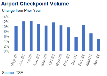 Passenger traffic through U.S. airports has reached record levels. More than 280 million people passed through TSA checkpoints in U.S. airports from January through April 2024, up 7% versus the same period last year and the highest volume ever through the first four months of the year.