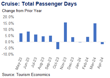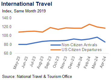 Many of the Americans passing through U.S. airports are traveling internationally. According to the Advance Passenger Information System (APIS), international trips by U.S. residents in the first four months of 2024 were 11% higher than a year ago and 20% above the same period in 2019.