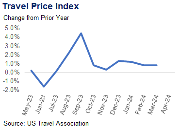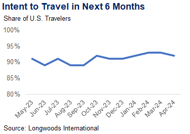 Several other indicators support an outlook of strong travel through the summer. In April, the Traveler Sentiment Survey by Longwoods International found that 92% of travelers plan to take a trip in the next six months. Measured monthly, plans to travel in the next six months have dipped below 90% only three times since the start of 2023.
