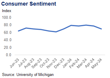 Despite easing inflation, the University of Michigan’s Consumer Sentiment Index fell the past two months, from 79.4 in March to 77.2 in April and to 69.1 in May. Consumers expressed concern over labor markets and expect unemployment to rise in the coming months. Year-ahead inflation expectations rose slightly from April to May, exceeding the range seen in the two years before the pandemic. Consumers seem unconvinced disinflation is in the pipeline, which is another reason the Federal Reserve will want to appear resolute in its determination to bring down inflation.