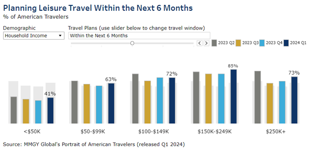 Travel intentions rose across most income categories in the first quarter of 2024. Intent to travel in the lower income brackets had declined in the two previous quarters, perhaps reflecting budgets strained by inflation and higher interest rates on mounting credit card debt. The increase during the first quarter is an encouraging sign for summer travel.