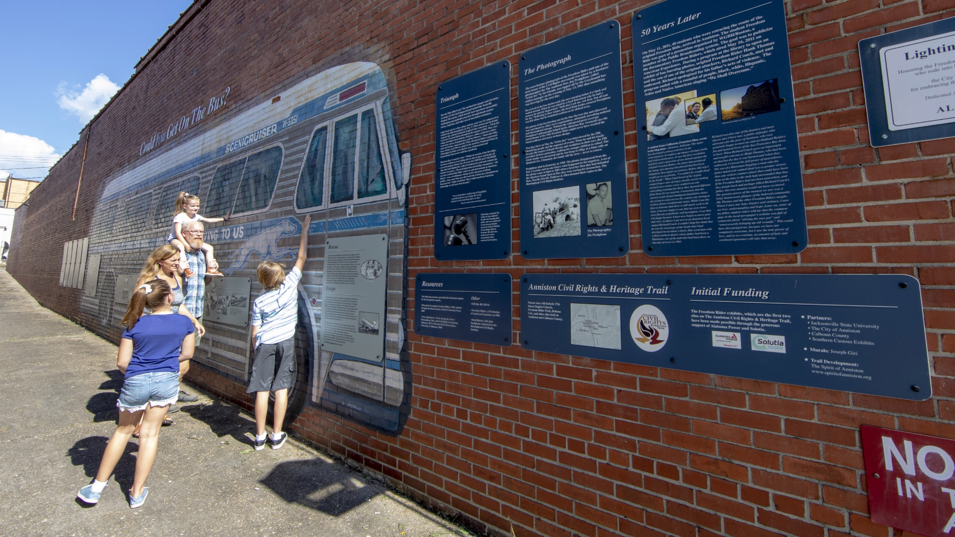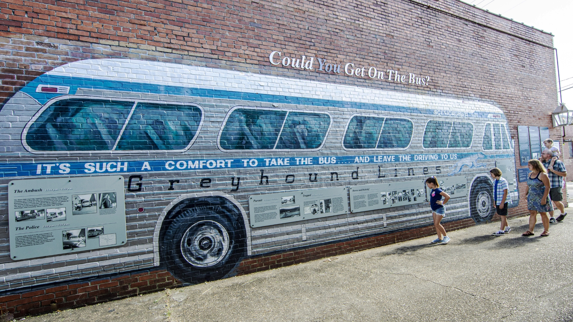 u0022Could You Get on the Bus?u0022 mural commemorates the Freedom Riders attacked in Anniston, Ala., on May 14, 1961, at the Greyhound Bus Depot. The mural faces the alleyway where the attack on these Freedom Riders began.