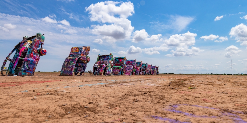 Add your own art to Cadillac Ranch, a classic stop along Route 66.