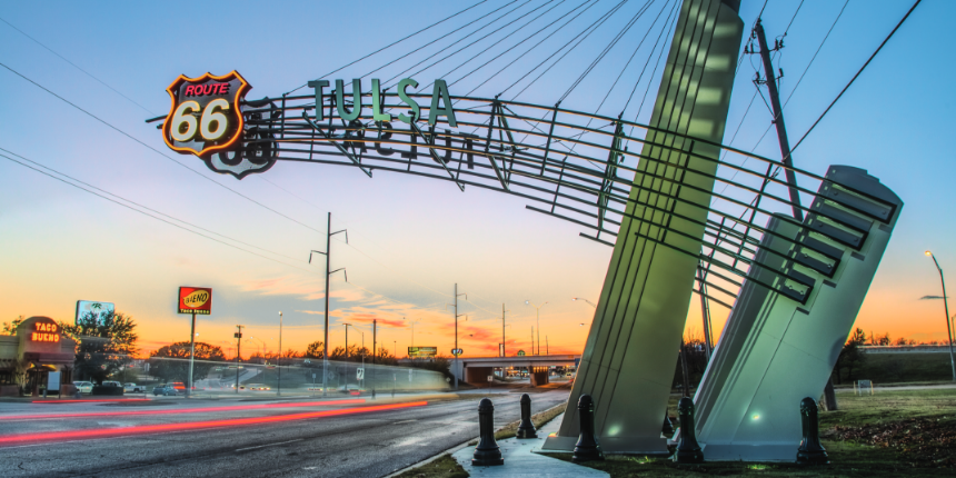 Route 66 runs right through downtown Tulsa, with arches bookending the East and West Gateways of town.