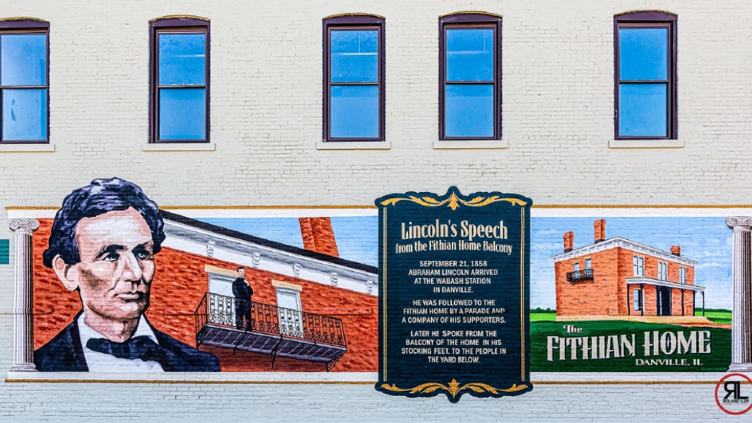 This mural captures Lincoln’s 1858 Danville visit, where he spoke barefoot from Dr. Fithian’s balcony during his Senate campaign tour.