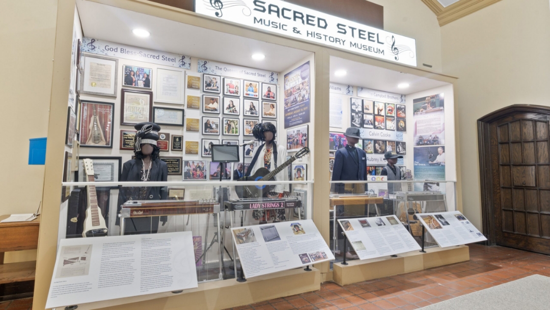 Groups can engage with interactive displays and listening stations at the Sacred Steel Music and History Museum.