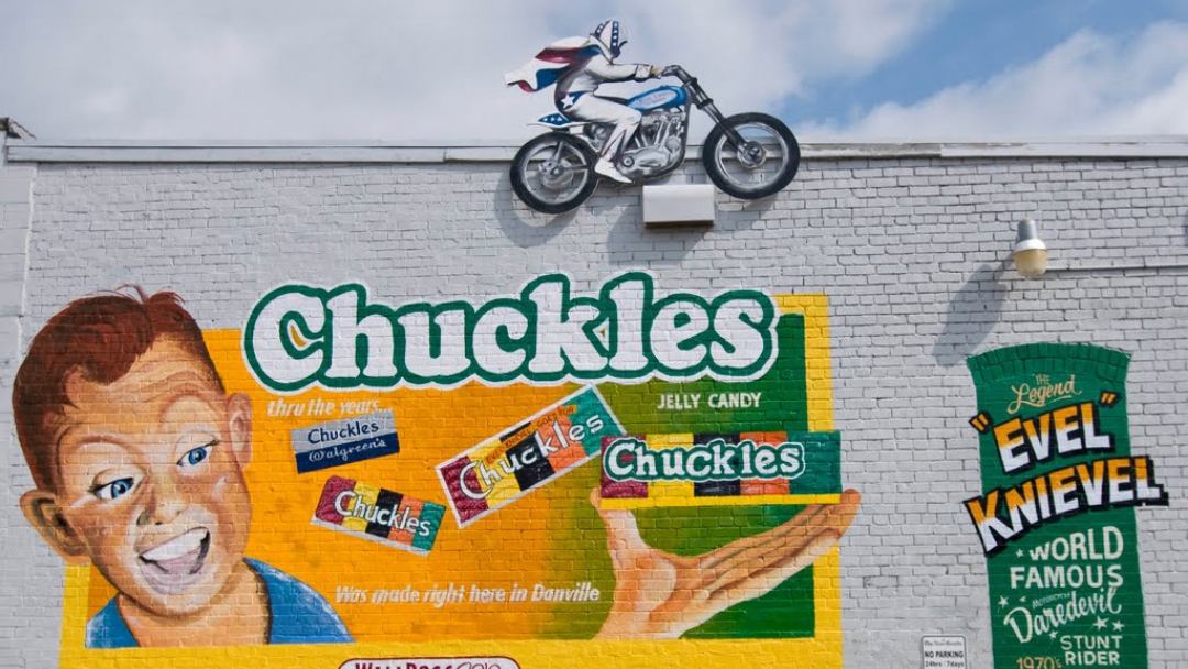 Sweet success was born in Danville—this mural honors Chuckles®, the sugar-coated candy created by Fred Amend in 1921.